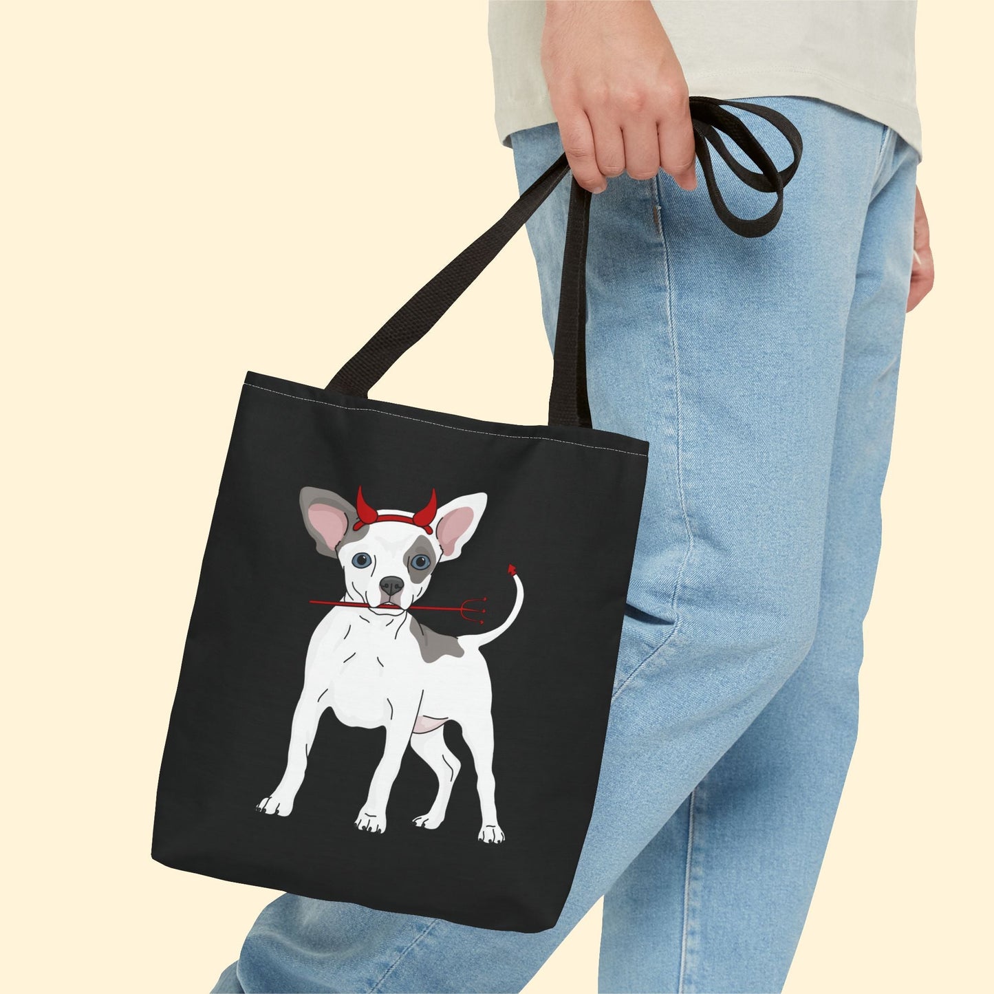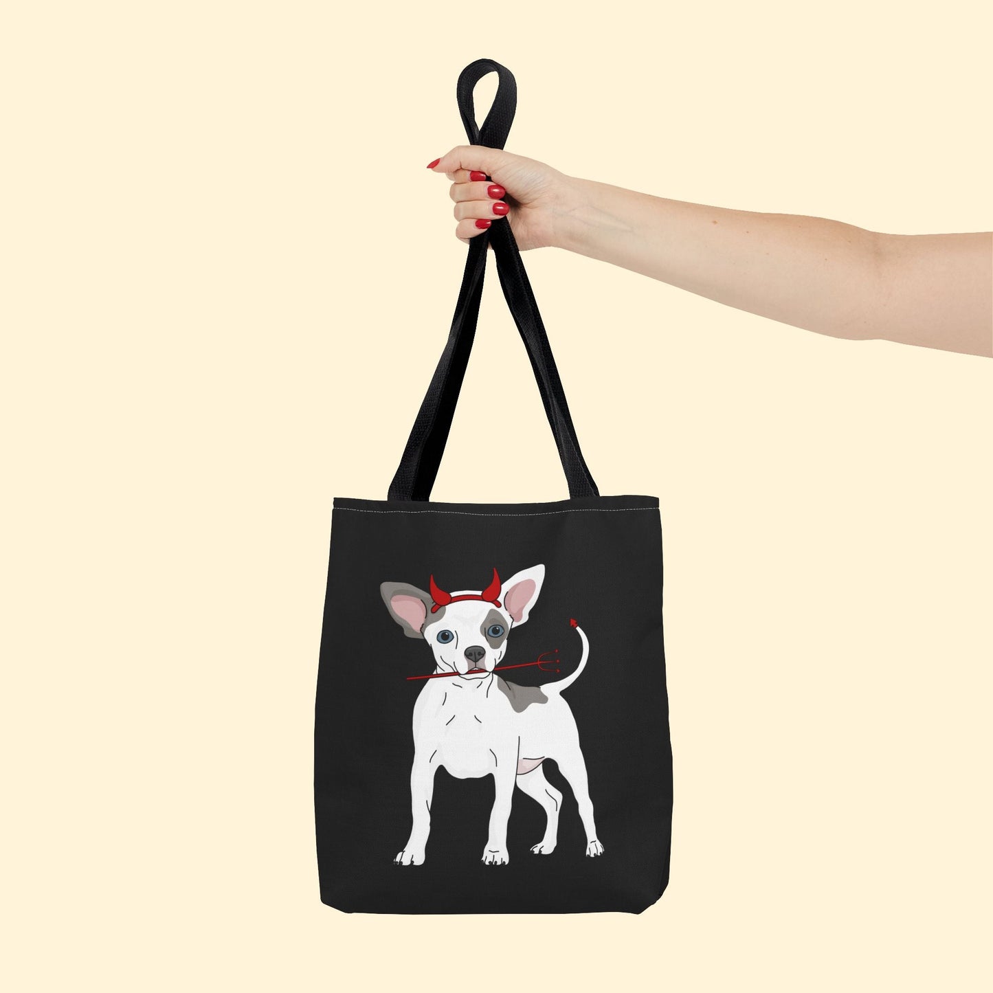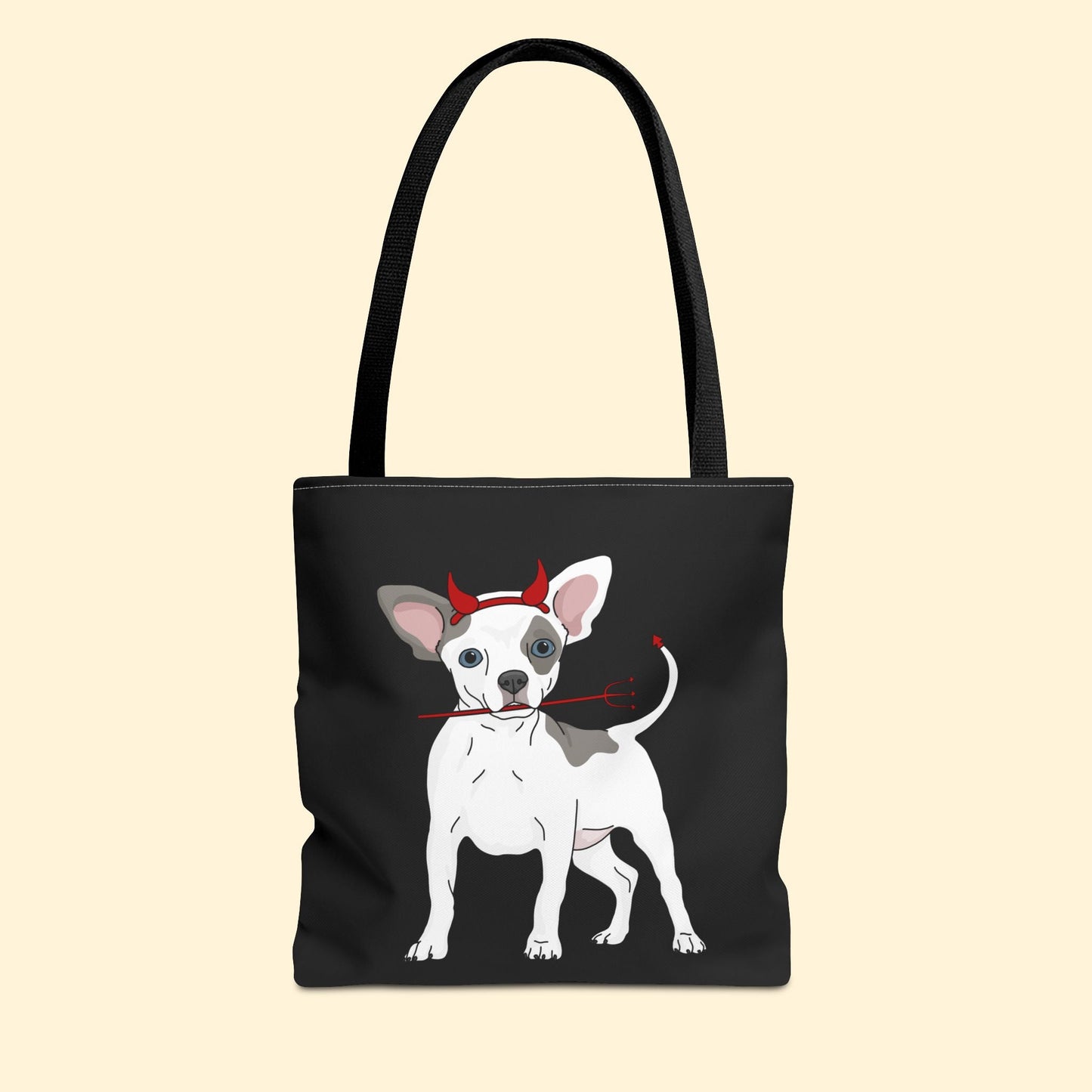 Happy Howl-o-ween! Celebrate spooky season with this adorable Devil Puppy Tote Bag, available in three sizes, featuring a chihuahua wearing devil horns and holding a pitchfork.
