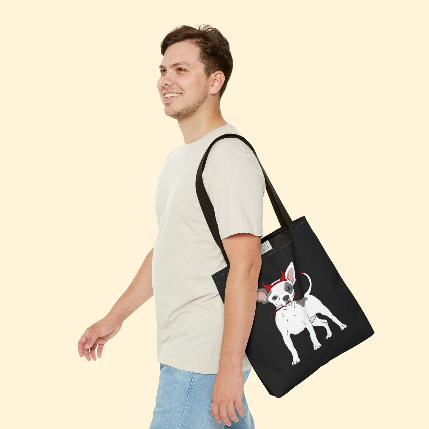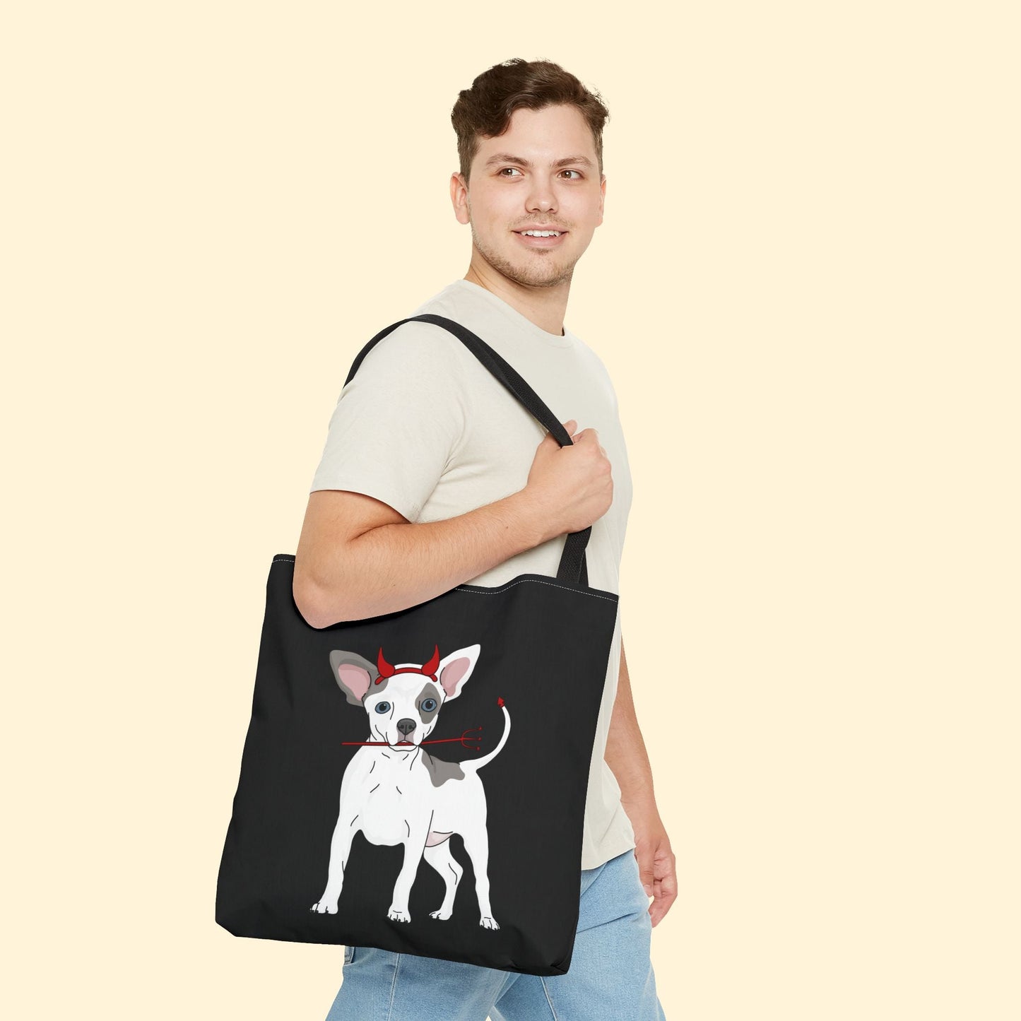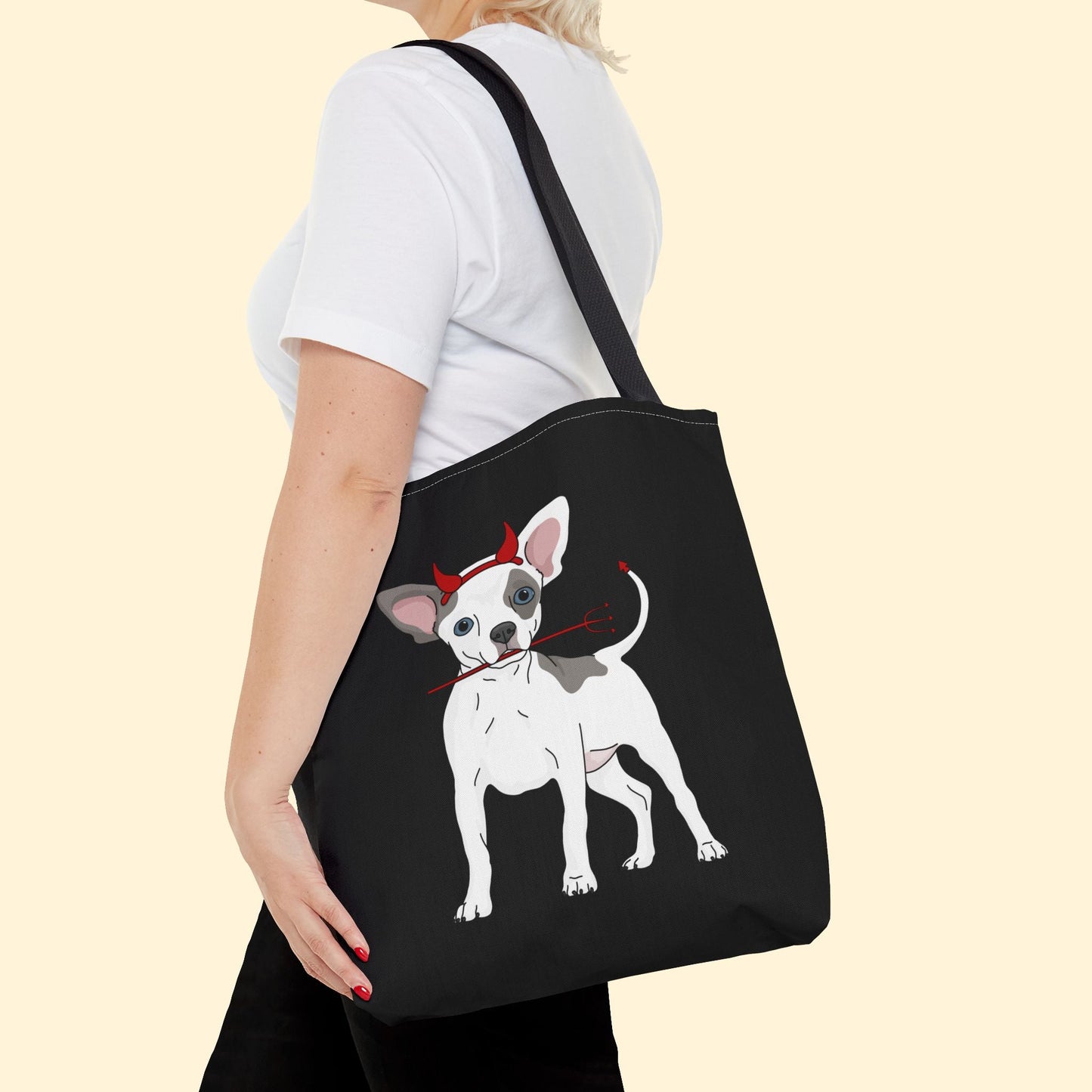 Happy Howl-o-ween! Celebrate spooky season with this adorable Devil Puppy Tote Bag, available in three sizes, featuring a chihuahua wearing devil horns and holding a pitchfork.